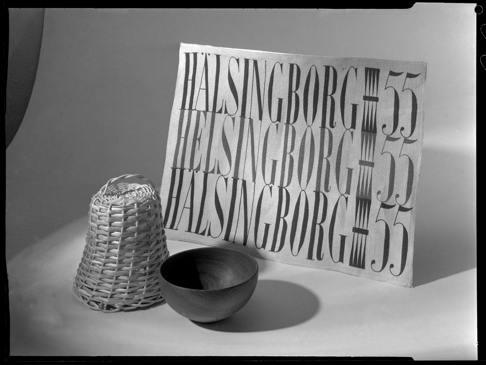 Bilden föreställer ett vykort med texten Hälsingborg H55 tre gånger. Framför står en korg som är öppen i botten, intill står en skål.