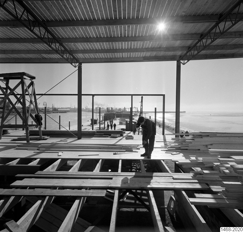 Bilden föreställer en paviljong under uppbyggnad. Vy från plan två under konstruktion. Där är en byggnadsarbetare. I Bakgrunden Parapeten och hamnen.