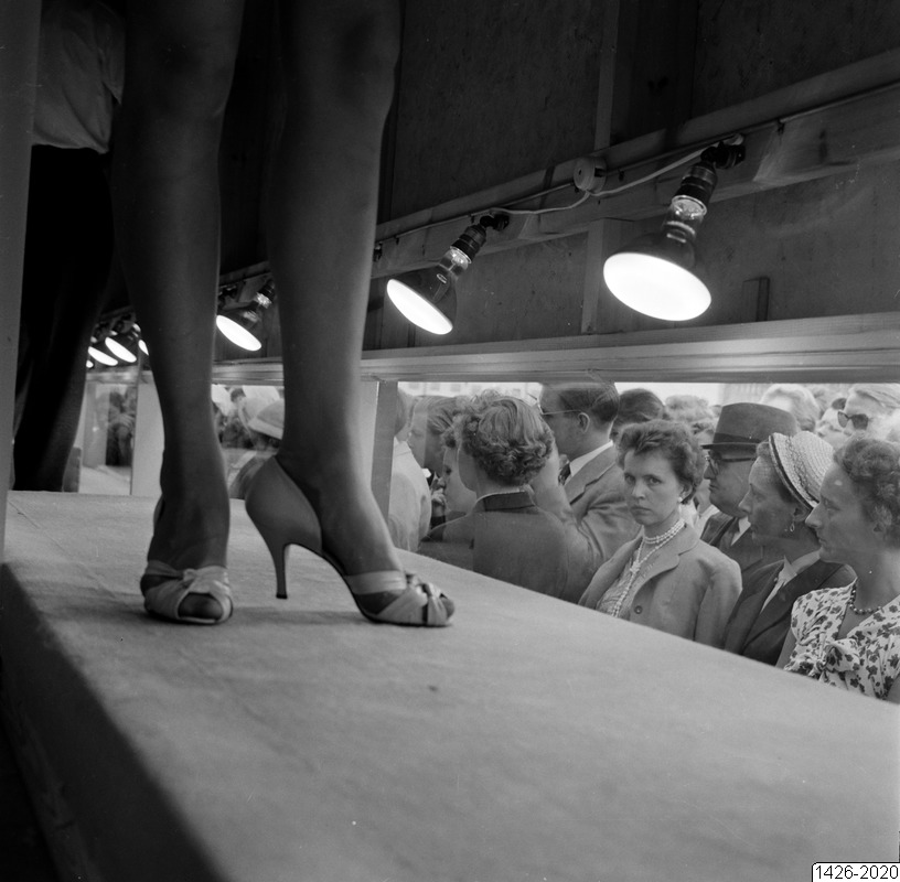 Bilden föreställer en smal scen, där golvet är belyst. Mitt i bild en kvinna från knäna och nedåt med fötter med pumps med klack. I bakgrunden publik.