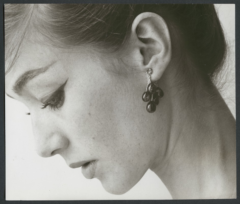 Bilden föreställer örhänge: droppformade ametister i silverfattning. Design Karin Torndahl, K Torndahls juvelerare AB. Kvinnohuvud i profil med fokus på örhänge.
