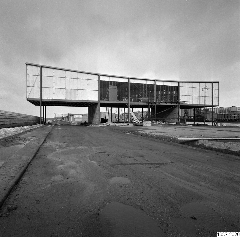 Bilden föreställer en stor öppen yta där någon byggverksamhet pågår. I bakgrunden en tvåvåningspaviljong. Till höger en mur.