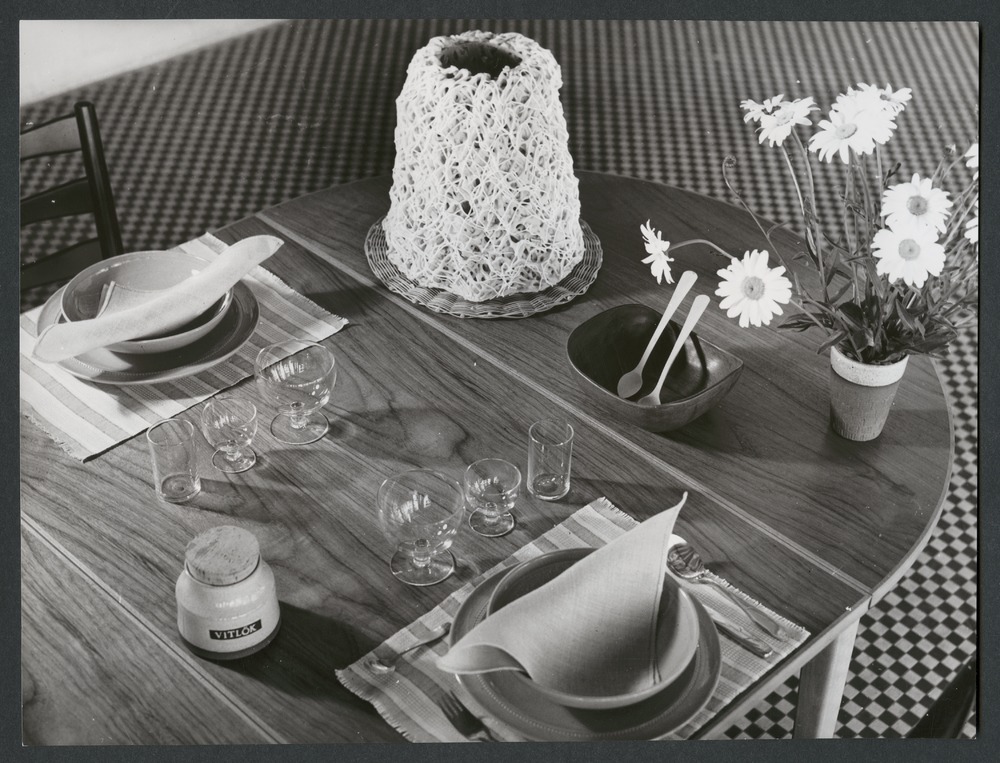 Bilden föreställer tabletter, servetter, teakskål och spettkaka på flätat fat från Malmöhus läns hemslöjdsförening. På matbord med stolar från Gemla AB finns även matservis ur serien "Old Höganäs" från AB Andersson & Johansson, glasservis av Bengt Orup, AB Johansfors Glasbruk. Bestick av Sigurd Persson, KF, kryddburk och vas av Signe Persson-Melin. (Jämför 222, 223-2020)
