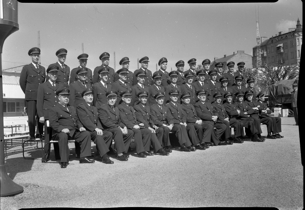 Bilden föreställer tre rader med män iklädda uniform, ca 40 stycken.