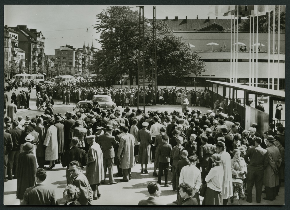 Bilden föreställer en folksamling. En stor samling människor på en öppen yta framför troligen entrén till utställningsområdet. Mitt bland människorna står två bilar. I bakgrunden bebgyggelse.