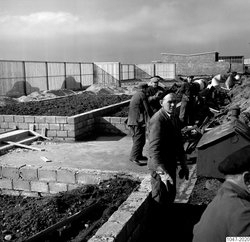 Bilden föreställer till vänster låga murar fyllda med material och bakomdem ett plank. Till höger byggnadsarbetare och i bakgrunden en byggnad, paviljong.