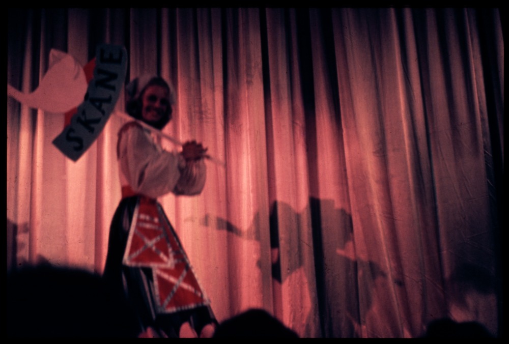 Bilden föreställer en scen med ett drapperi i bakgrunden. På scenen står en kvinna iklädd folkdräkt. Kvinnan bär på en skylt med texten skåne, ovanför texten en vit gås.