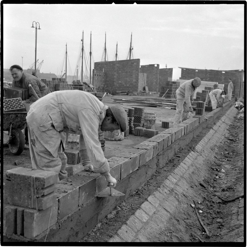 Bilden föreställer en mur under uppbyggnad av tre murare. I bakgrunden fasader.