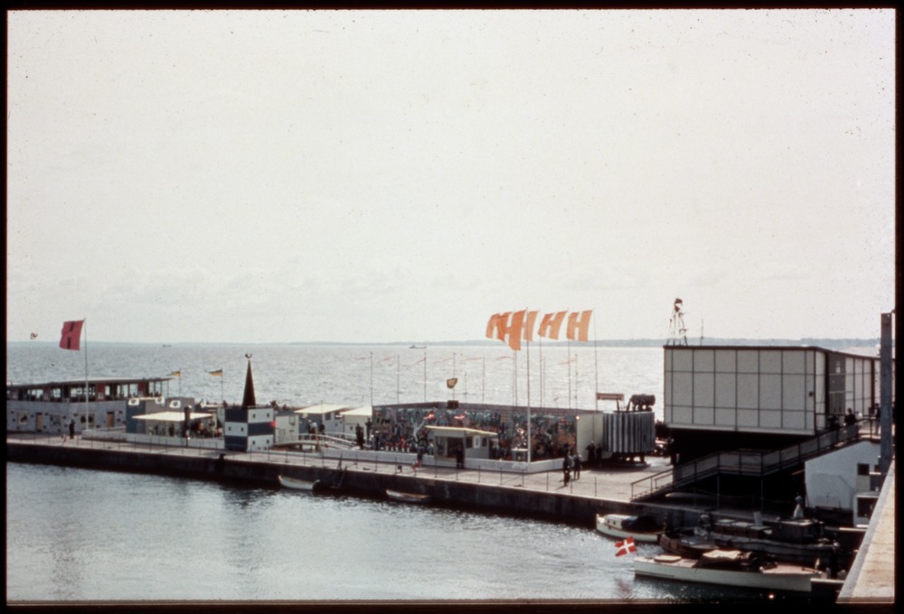Bilden föreställer vy över utställningsområdet på Parapeten med paviljonger och flaggor. I förgrunden hamnbasäng med båtar.