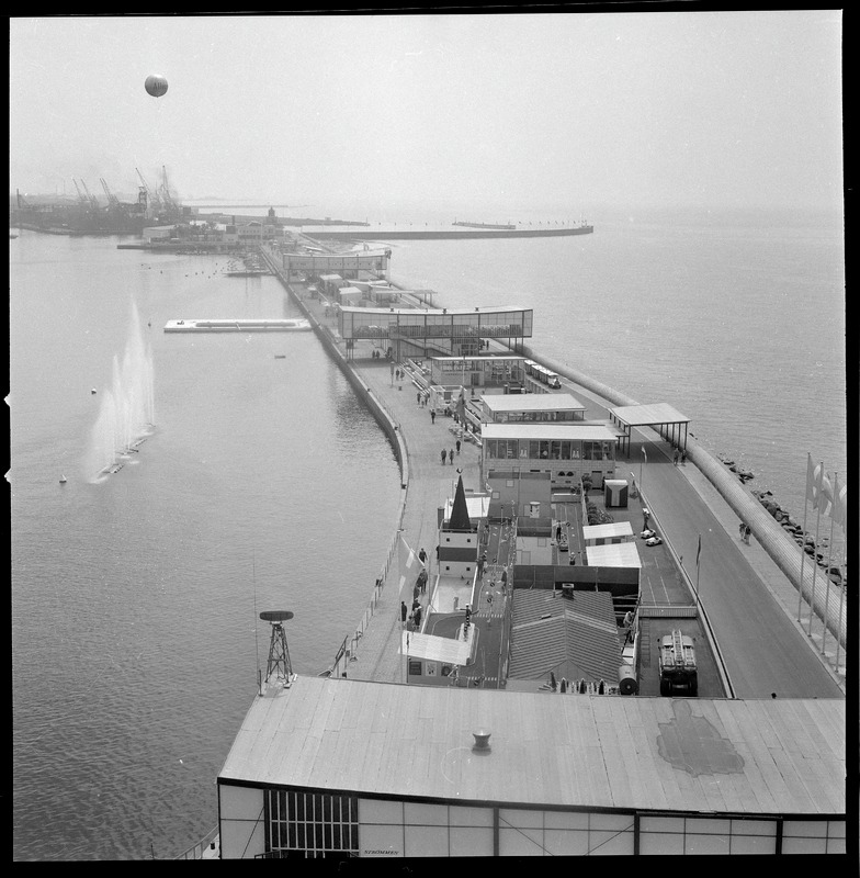 Bilden föreställer parapeten med byggnader i fågelperspektiv. Till vänster hav och till höger hamn.