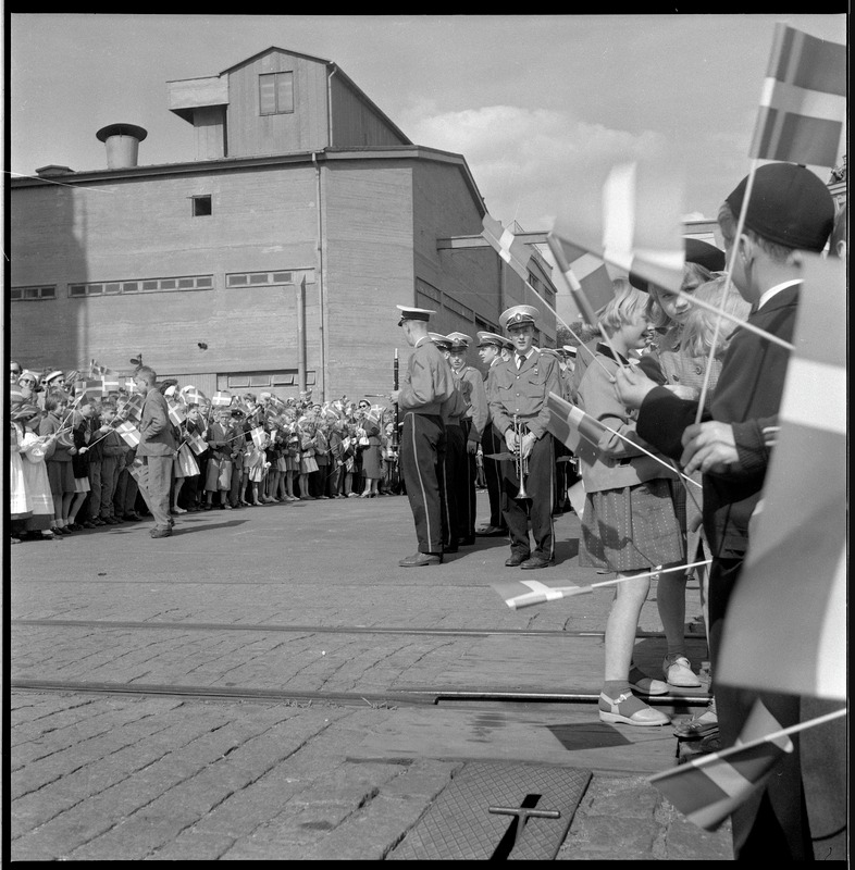 Bilden föreställer människor samlade på var sida om en gata, några med flaggor i händerna. I mitten står troligen en musikkår. I bakgrunden ett hus.