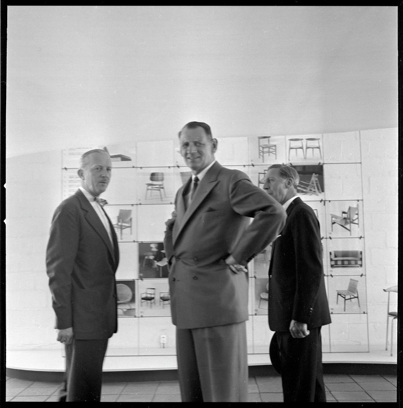 Bilden föreställer tre män i trekvartsfigur stående i ett rum. Bakom dem en hylla med miniatyrmodeller av stolar.