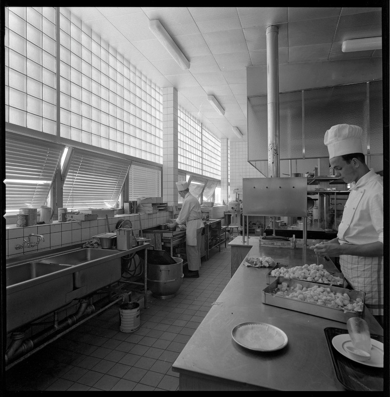 Bilden föreställer troligen ett restaurangkök med två personer i. Den ene kanske skalar potatis.