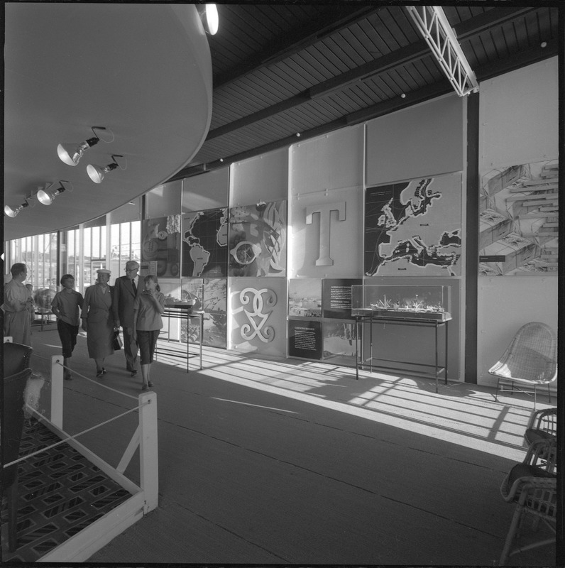 Bilden föreställer en del av en utställningshall. Där är en vägg med planscher och på ett bord står en modell av ett fatyg. Bak i rummet går besökare