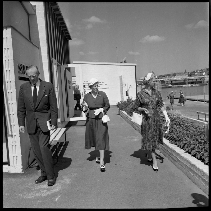 Bilden föreställer två kvinnor och en man gående på en gångbana mellan byggnad och plantering. I bakgrunden byggnader.