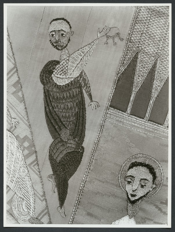 Bilden föreställer "The Apostles" (detalj) design av Sten Kauppi AB Textilatélier Licium, Stockholm Sverige. Fotot önskas i retur av Föreningen Handarbetes Vänner. Fotot är ett utsnitt av en större bonad med två broderade män och andra detaljer.