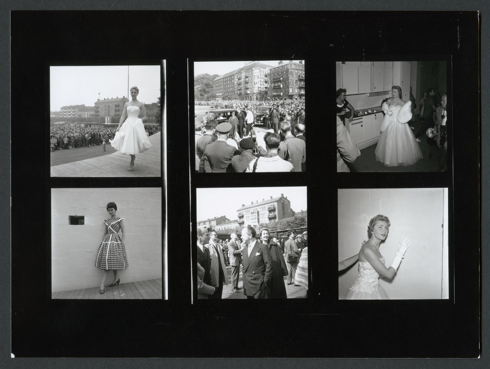 Kontaktkopia med sex olika fotografier. Bild ett kvinna i festklänning gående på scen, i bakgrunden folksamling och bebyggelse. Under den bild på en kvinna i klänning stående vid husfasad. Uppe i mitten folksamling och i mitt i bild två bilar ur den ena kliver kung Gustv VI Adolf och drottning Louise, i bakgrunden bebyggelse. Nederst i mitten folksamling, framför den Sigvard Bernadotte och i bakgrunden bebyggelse. På bilderna till höger Miss Universum Hillevi Robin. På den översta bilden i festklänning stående i ett kök, på den nedre bilden bröstbild där hon lutar sig mot en vägg.