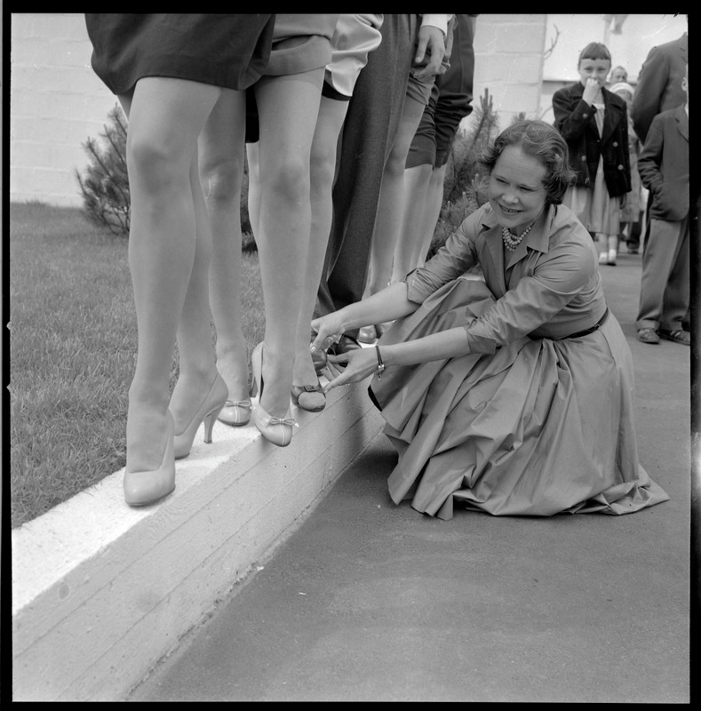 Bilden föreställer kvinnors ben nedanför korta kjolar och med skor gåendes på en låg mur. En kvinna sitter på huk och håller på att rätta till en sko.