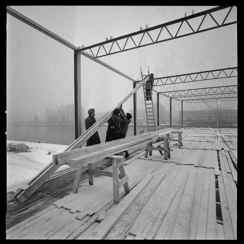 Bilden föreställer en paviljong under uppförande. På marken byggnadsarbetare, byggnadsmaterial och byggnadsställning samt stege. Stomme av metall.