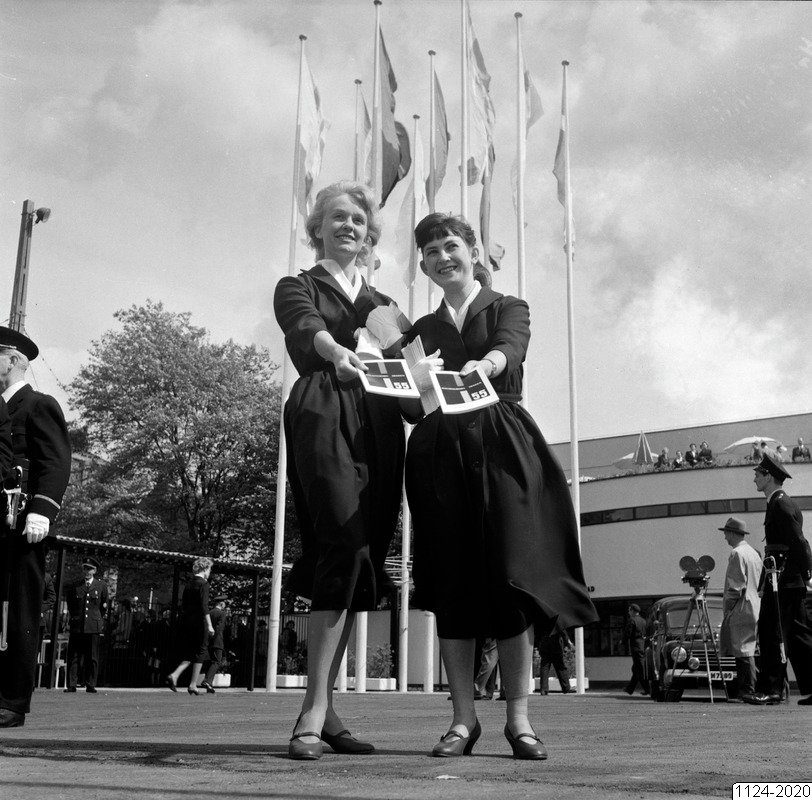 Bilden föreställer två mässvärdinor som delar ut program vid entrén till H55. I bakgrunden konserthuset.