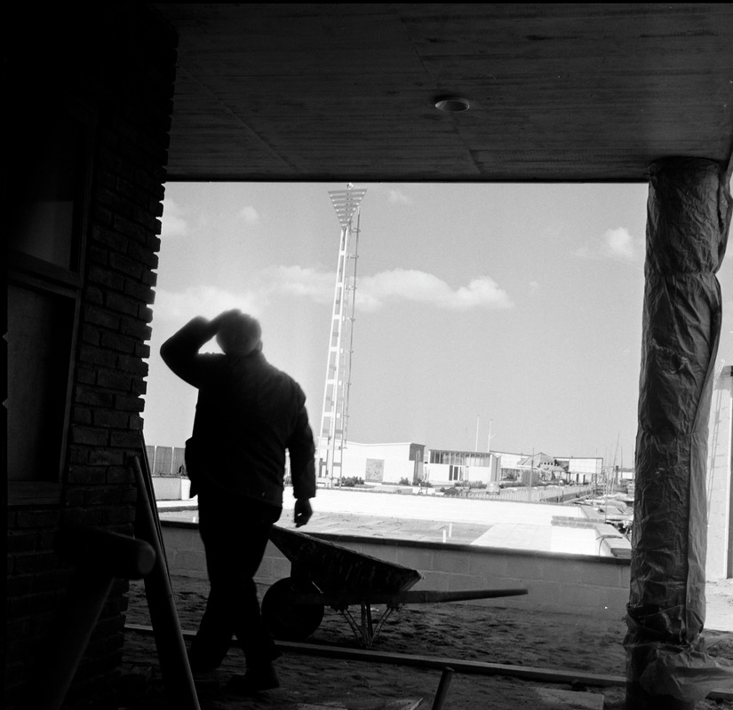 Bilden föreställer en öppen överbyggd yta med en pelare i hörnet. Till vänster husfasad med fönster. Mitt i bild en skottkärra och en man. I bakgrunden byggnader.
