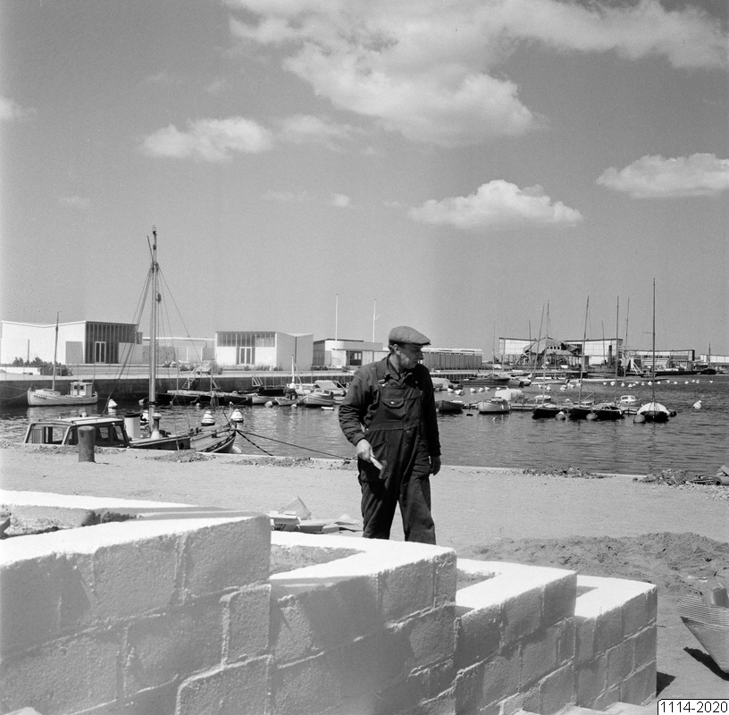 Bilden föreställer en man som håller på att mura en mur. I bakgrunden hamn, båtar och Parapeten med paviljonger.