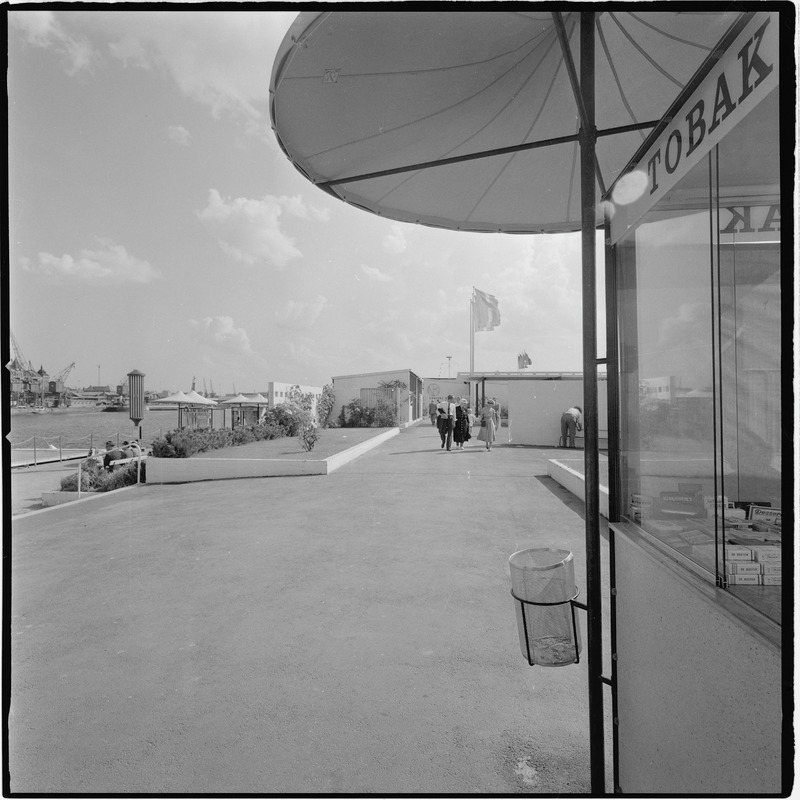 Bilden föreställer en stor öppen yta framför byggnader och hamn i bakgrunden. I högerkanten står en tobakskiosk.