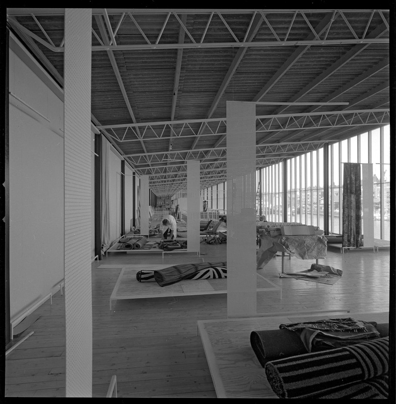 Bilden föreställer en utställningshall som man är på väg att fylla med innehåll. På små podier ligger vävnader.