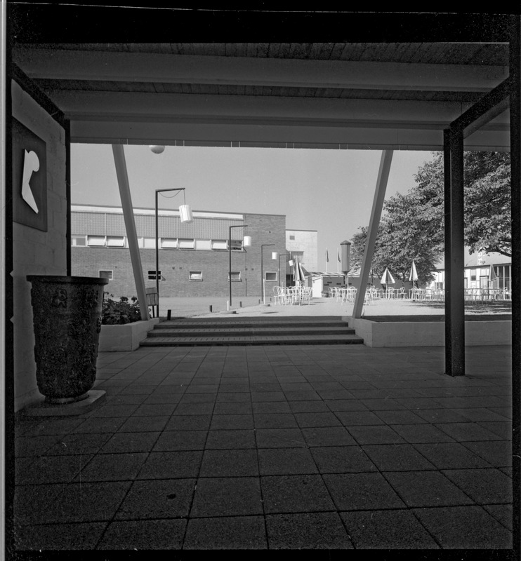 Bilden föreställer ett delvis överbyggt promenadstråk. Mitt i bild övergångsställe. I bakgrunden byggnader.