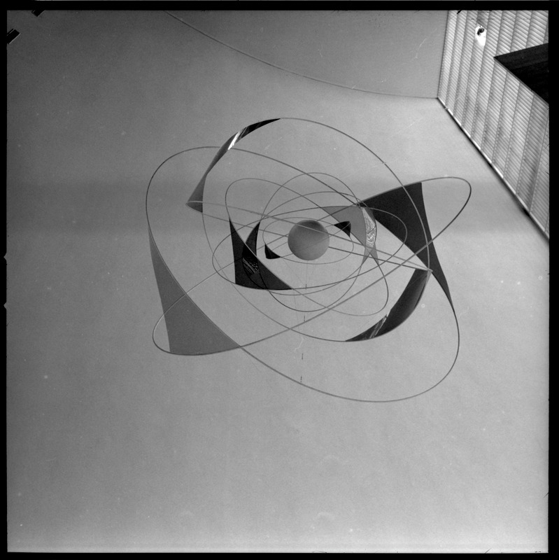 Bilden föreställer troligen en skulptur elle annan form av konstverk som en atom med ovala cirklar och infällda trianglar med kärna i mitten.