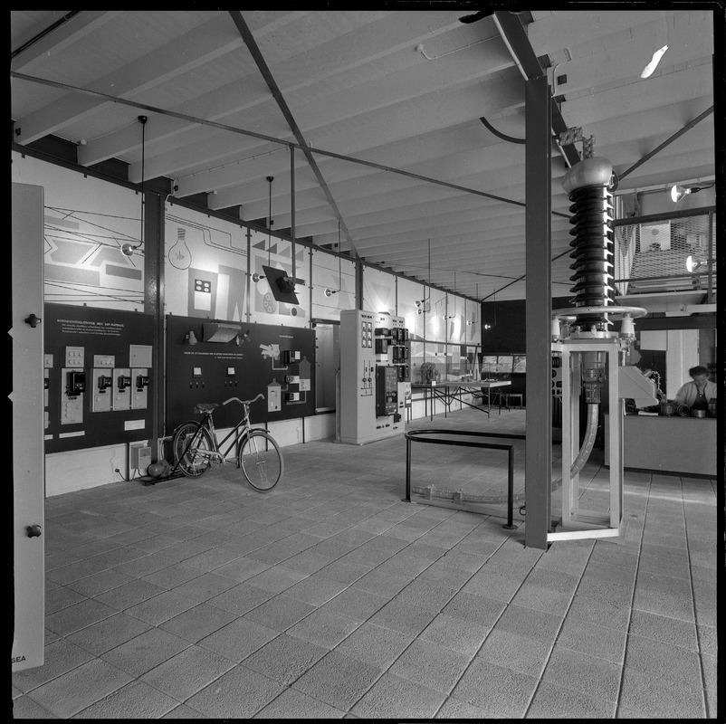 Bilden föreställer en utställningshall troligen på tema elektronik. På väggarna olika apparater. Där står också en cykel.