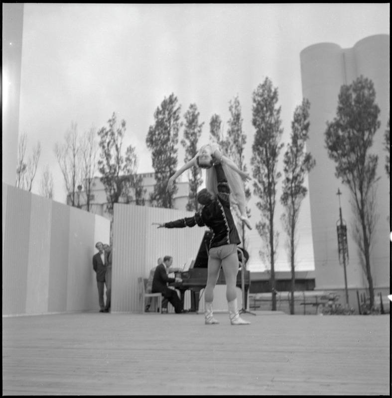 Bilden föreställer en scen med en person i scenkläder. I bakgrunden en flygel med en pianist. Där bakom träd.
