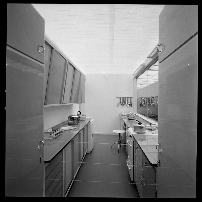 Bilden föreställer ett smalt kök. Till vänster bänk med skåp undertill och ovanför. På bänken står husgeård. Till höger bänk med skåp under och spis i mitten, med kastruller på. På bakre väggen hänger slevar.