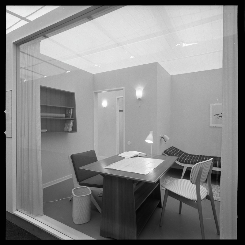 Bilden föreställer en hörna av ett rum. I förgrunden ett skrivbord med lampa och en stol vid var sida, samt en papperskorg. I bakgrunden del av en säng och på väggen en hylla.
