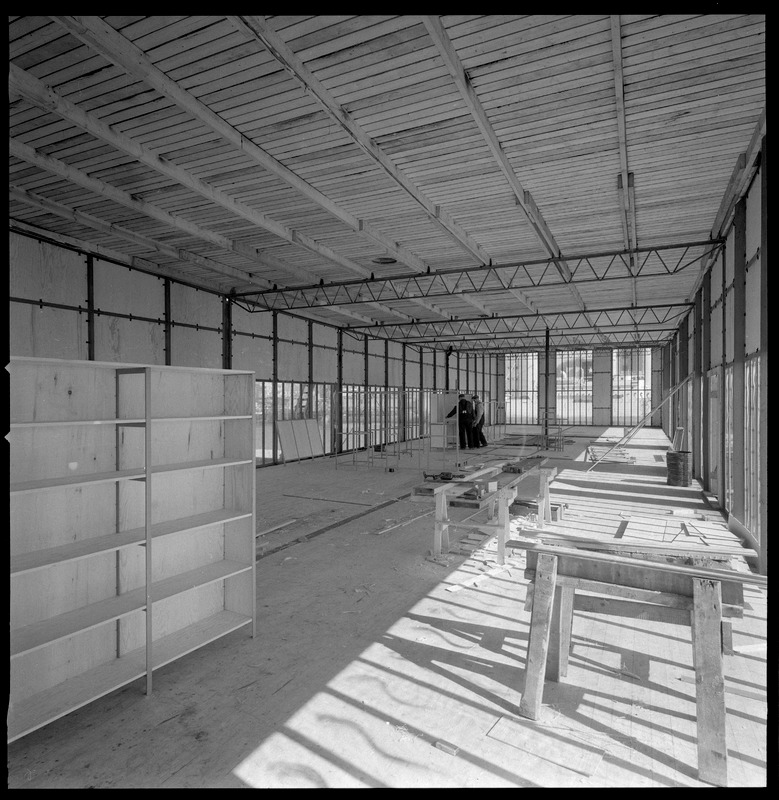 Bilden föreställer en paviljong på väg att inredas. Till vänster bockar, till höger hylla.