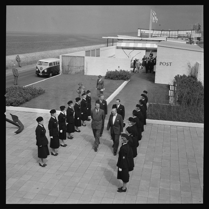 Bilden föreställer ungefär sexton kvinnor i uniform stående på två led mittemot varandra. Mellan dessa kommer fyra personer gående. I bakgrunden planetringar och paviljonger. På en byggnad skylten Post.