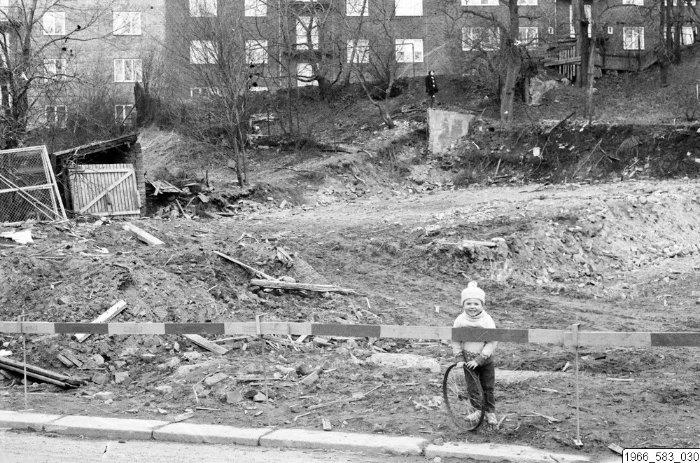 Bygge vid Gustav Adolfsgatan vid Nytorgsbacken med ett barn i förgrunden