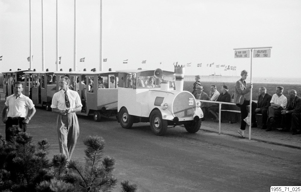 Litet lokomotiv passerar folk på piren
