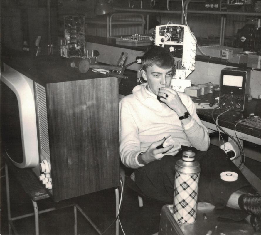 Interiör från Svenska TV-bolaget. En anställd tar en paus och äter en smörgås. På bordet står en termos.