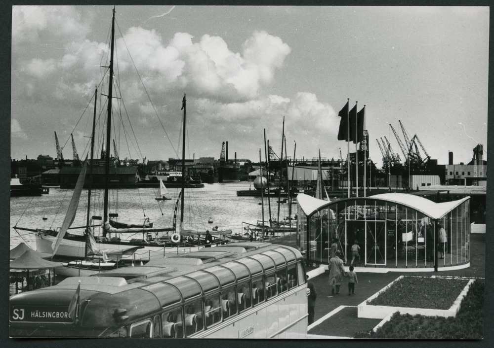 Bilden föreställer Volkswagen paviljongen. Ett utsnitt av utställningsområdet. I förgrunden en buss, där bakom en paviljong. Till vänster i bild hamnen med segelbåtar. I bakgrunden lyftkranar. Där står också tre flaggstänger.