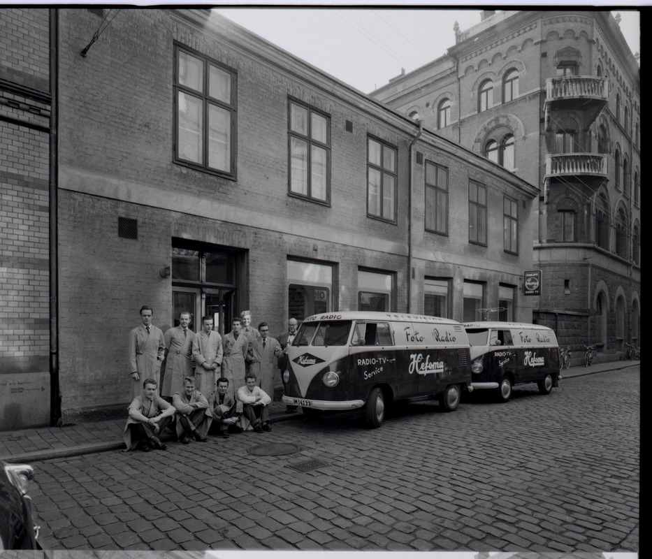 Fotografi som avbildar Hefomas Serviceavdelning med personal och bilar på Norra Kyrkogatan.