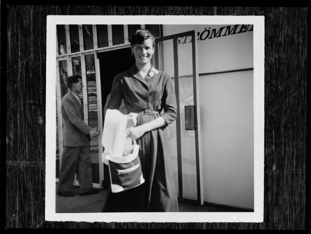 Bilden föreställer i förgrunden en kvinna i trekavsrtfigur med väska och kofta på armen. Bakom henne en husfasad med texten Strömmen.