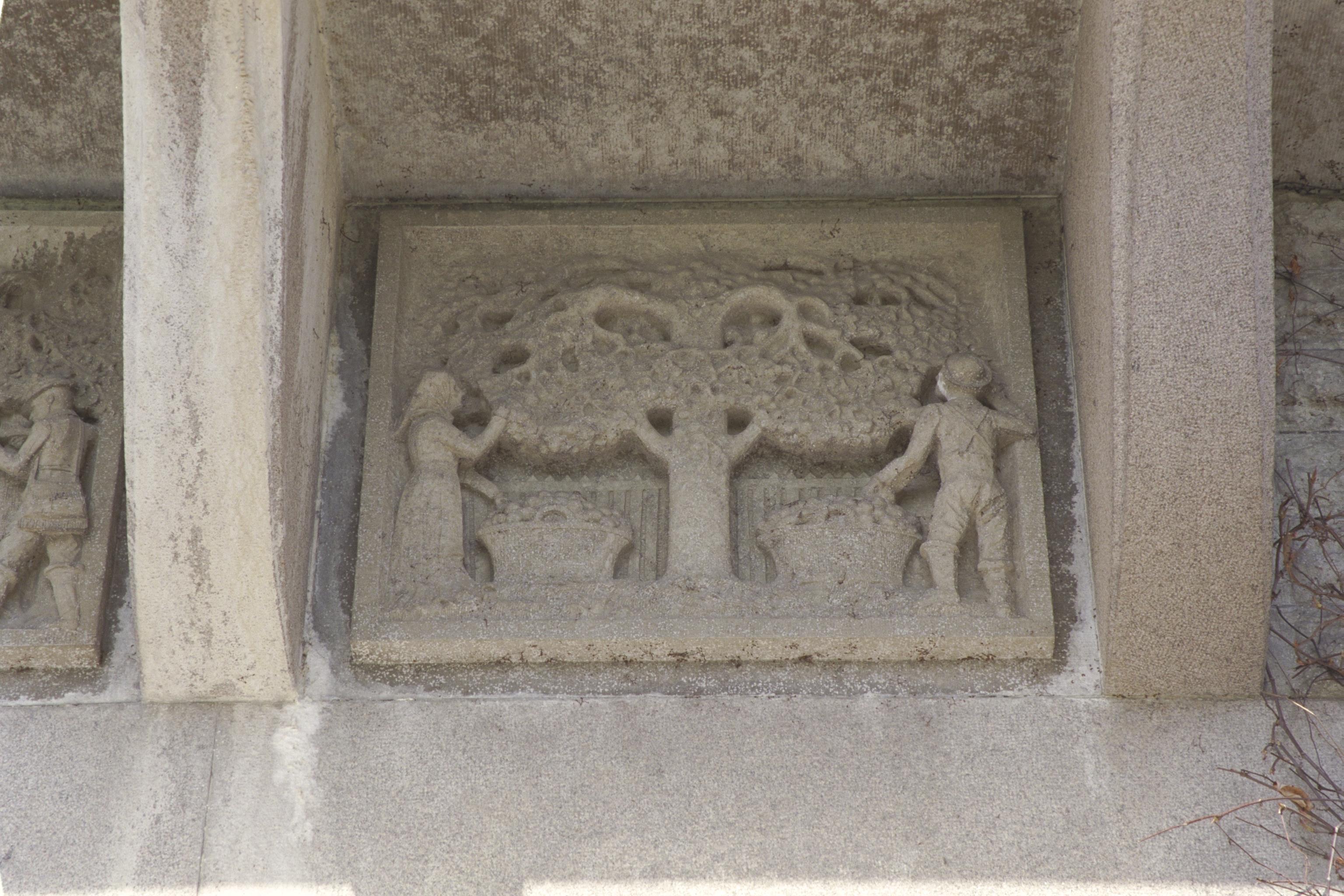 Slottets södra fasad, parkfasaden. Den högra balkongens högra relief