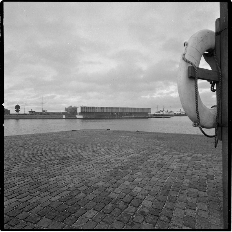 Bilden föreställer en öppen yta, kaj med en livboj till vänster. I bakgrunden hamn samt byggnad.