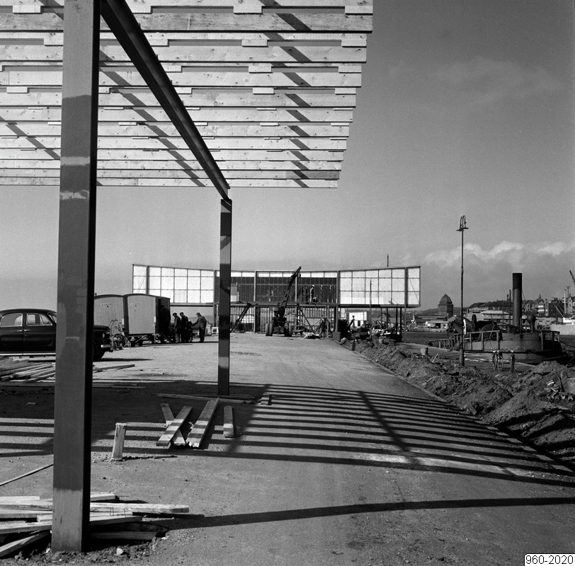 Bilden föreställer i förgrunden en öppen överbyggd plats. Där bakom en öppen yta. I bakgrunden en paviljong och framför den byggnadsarbete.
