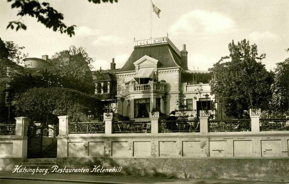 Exteriör bild av Restaurangen Helenehill. Bilden är tagen utanför fastigheten som låg på Drottninggatan 78 och i bildens förgrund syns en mur och trappan till restaurangen.