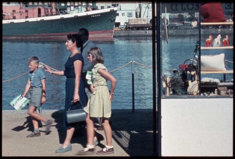 Bilden föreställer en kvinna och två barn gåendes på en kaj. Hamn och fartyg i bakgrunden. Till höger liten byggnad, troligen souvenibutik.