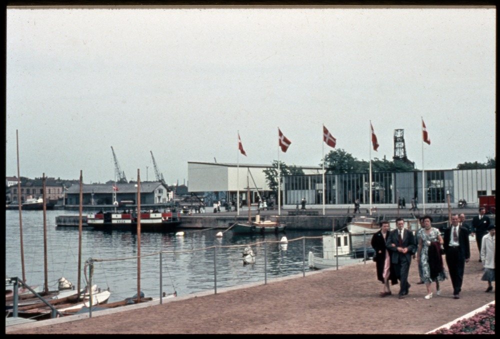 Bilden föreställer vy över utställningsområdet. I förgrunden promenad med flanerande människor. I bakgrunden hamn, båtar, flaggor och paviljonger.