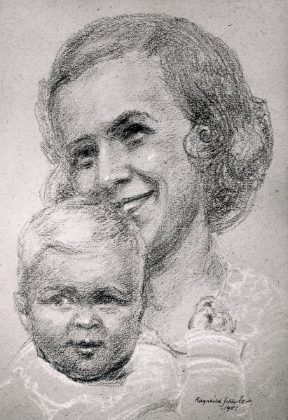 Teckning föreställande mor och barn. Modern föreställer fru Gösta Wachtmeister. Gjord av Ragnhild Schlyter 1951.