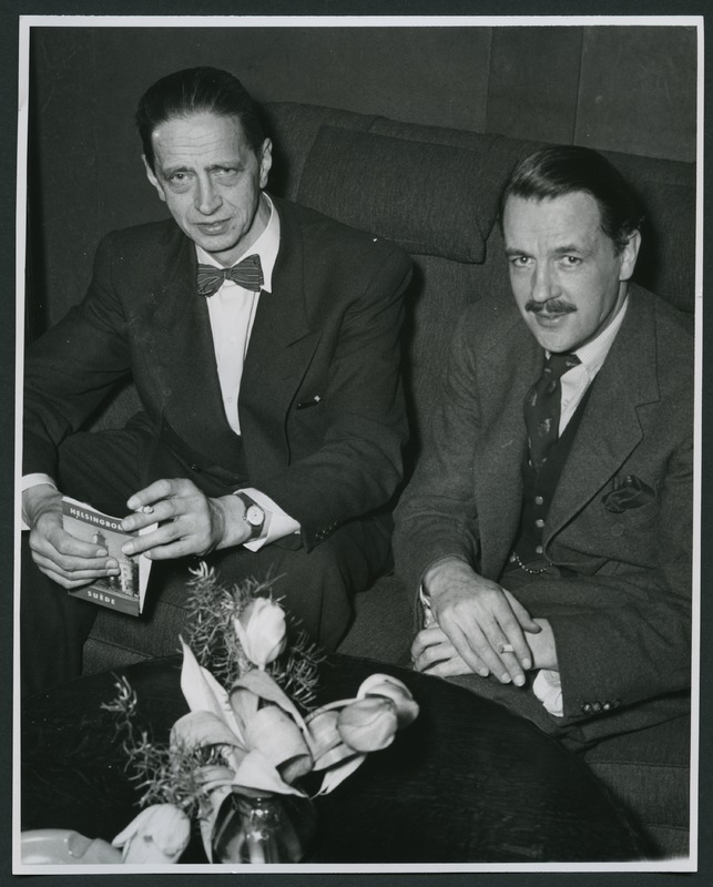 Bilden föreställer två herrar med varsin cigarett i handen. Tv M Jean Carlu president i Aliance Graphique Inetrnationale, Paris med Helsingborgskarta på franska i handen. Två män sittande i en soffa vid ett soffbord med blommor.