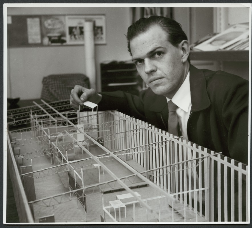 Bilden föreställer bister karl framför modell av ustställningshall.